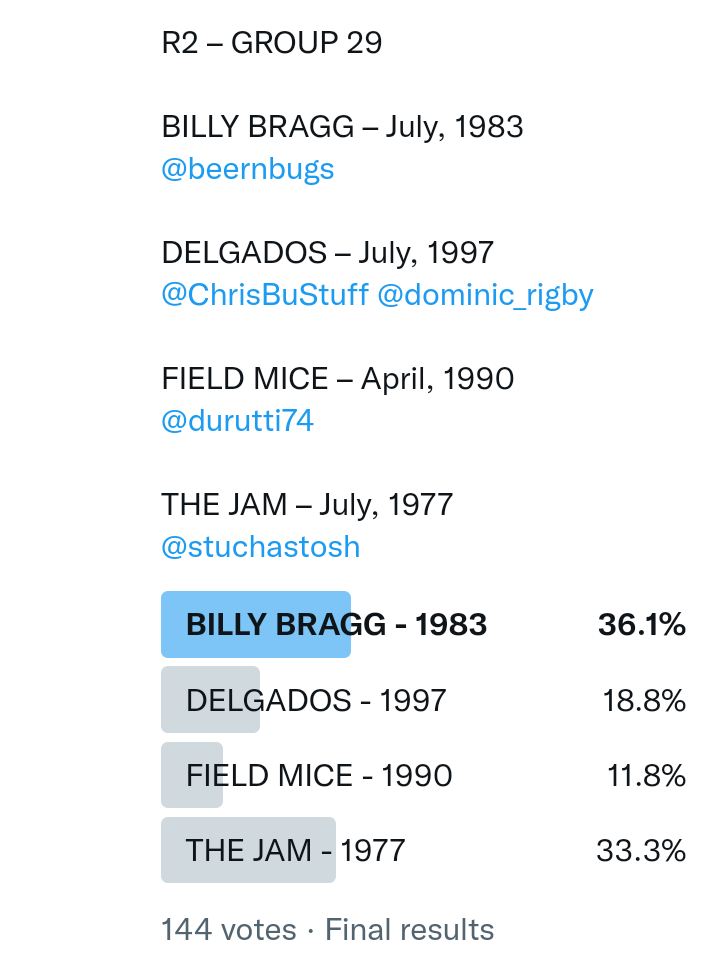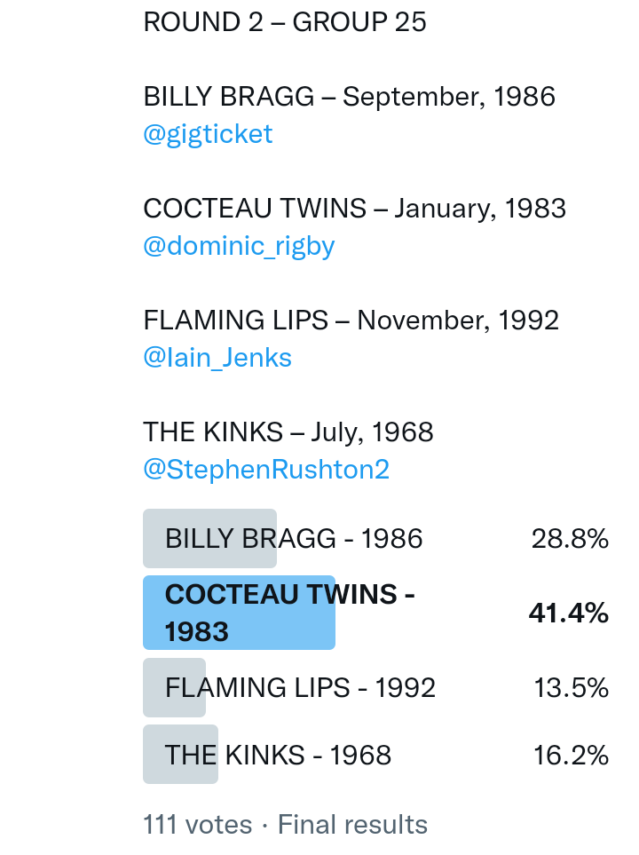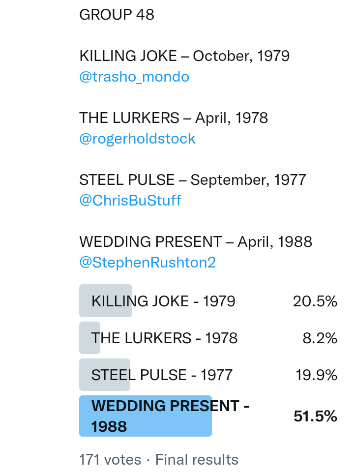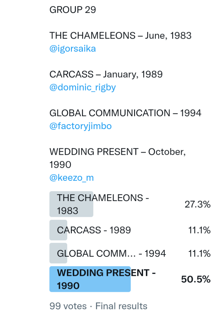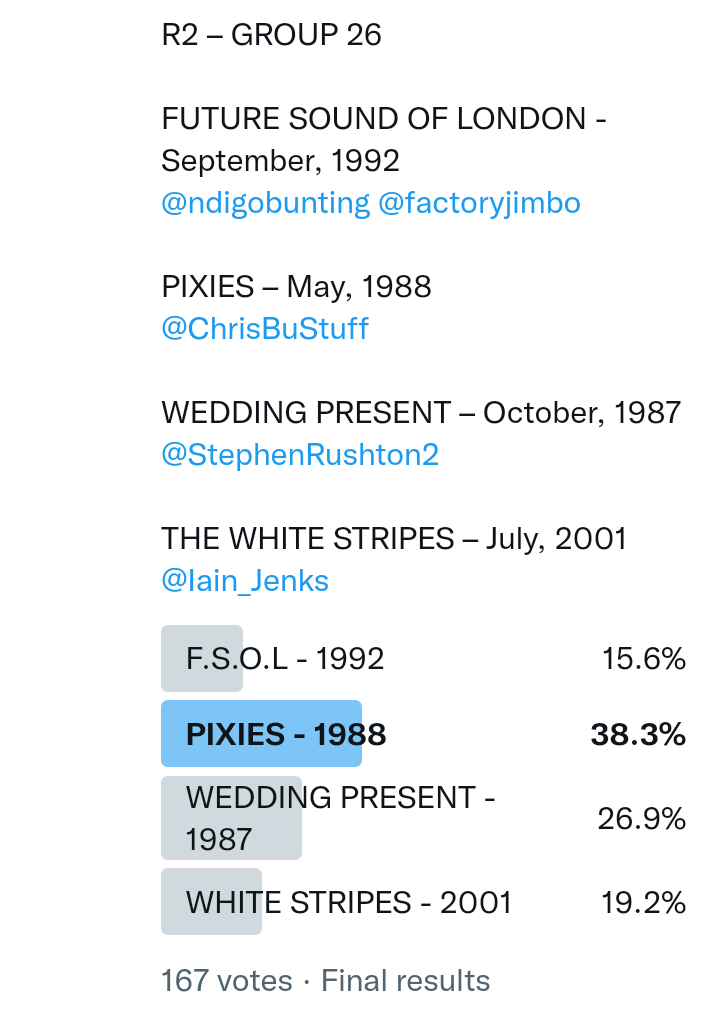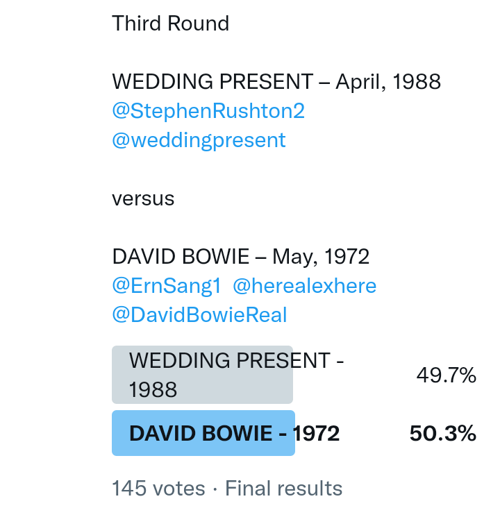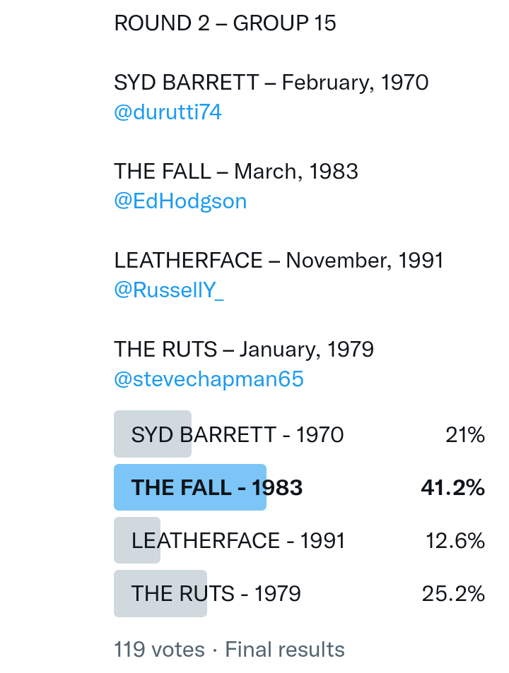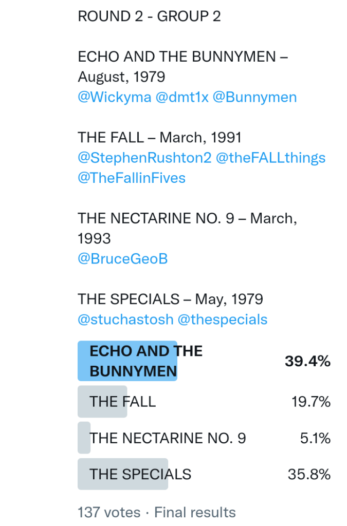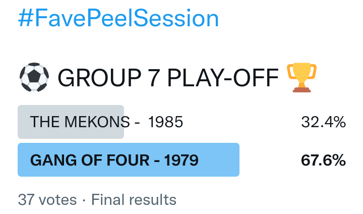 And so after much a to-ing and a fro-ing which included duplications and protestations and then affirmations amid the Bauhaus conspiracy where they appeared to sail into round three without actually doing very much, I now issue forth the THIRD ROUND DRAW for #FavePeelSession (minus Bauhaus) from which you will see some mouth-watering battles ahead.