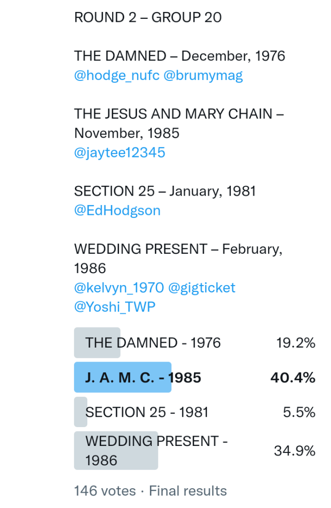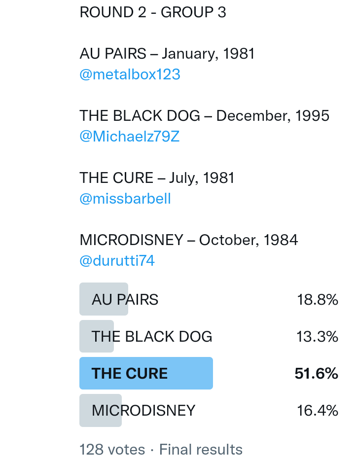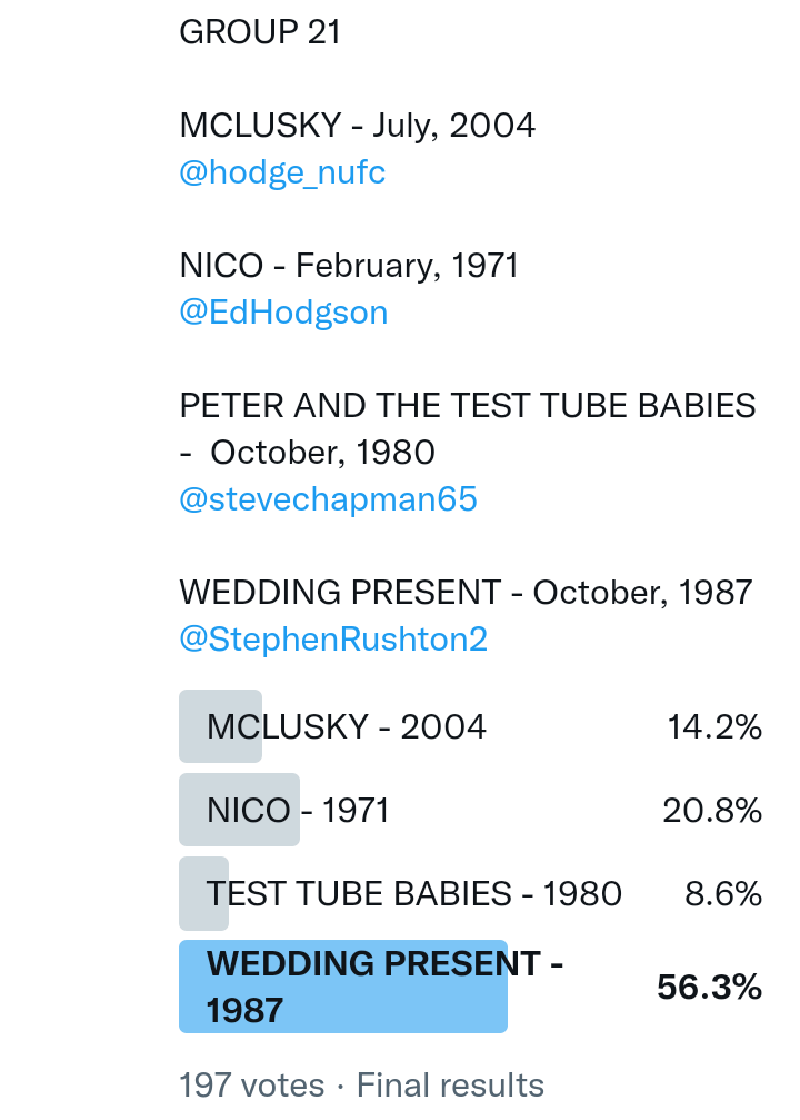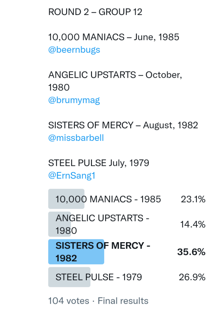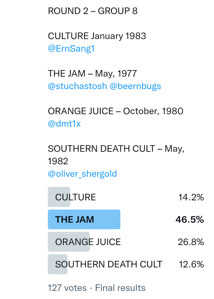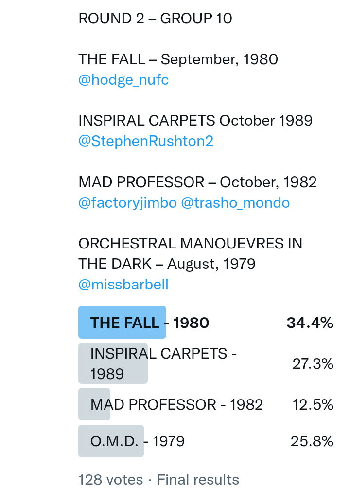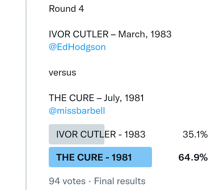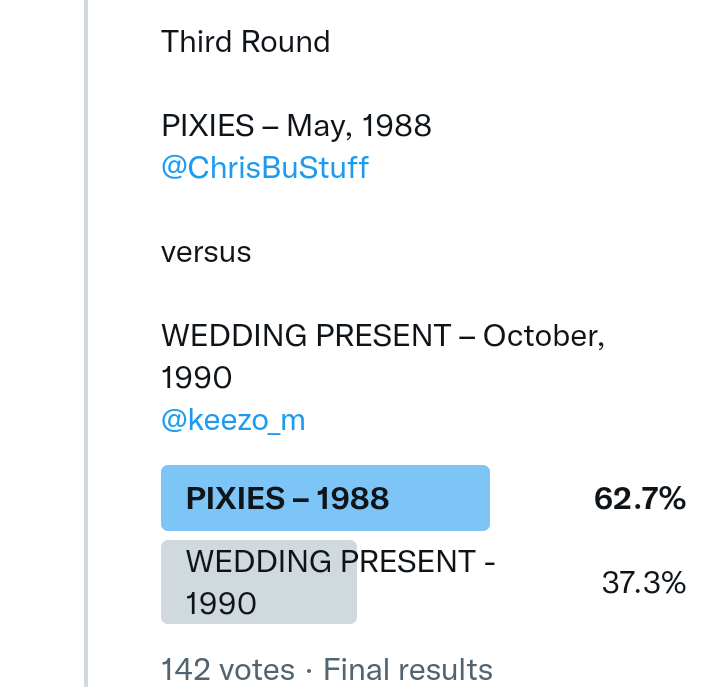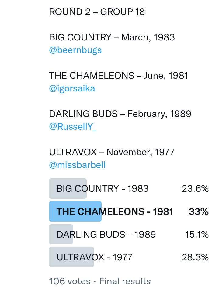 And so after much a to-ing and a fro-ing which included duplications and protestations and then affirmations amid the Bauhaus conspiracy where they appeared to sail into round three without actually doing very much, I now issue forth the THIRD ROUND DRAW for #FavePeelSession (minus Bauhaus) from which you will see some mouth-watering battles ahead.